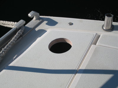A piece of 1/2" marine plywood cut in an 7" circle, was laminated to the underside of the deck as a backing plate, to increase the strength of the deck in this heavily loaded area. Unfortunately, I didn't take any pictures of this step.