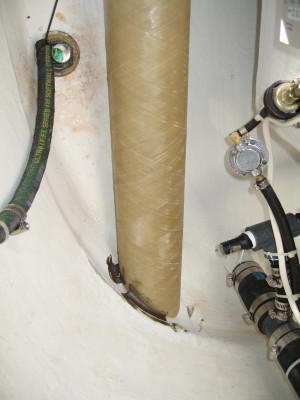 The bury tube tacked onto the hull using just a bit of Swiss Glas. This is the tricky part of the operation. You've got to make sure the tube is absolutely plumb. We did it by putting the radar pole in it, measuring with a level, then hand holding the pole until the Swiss Glas hardened. Putting a bit of extra catalyst can speed the process.